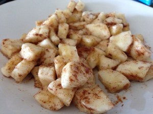 Slice banana length-wise twice then cut into 1/4 inch pieces. Sprinkle with 1/2 tsp cinnamon and warm 15-20 seconds in microwave.