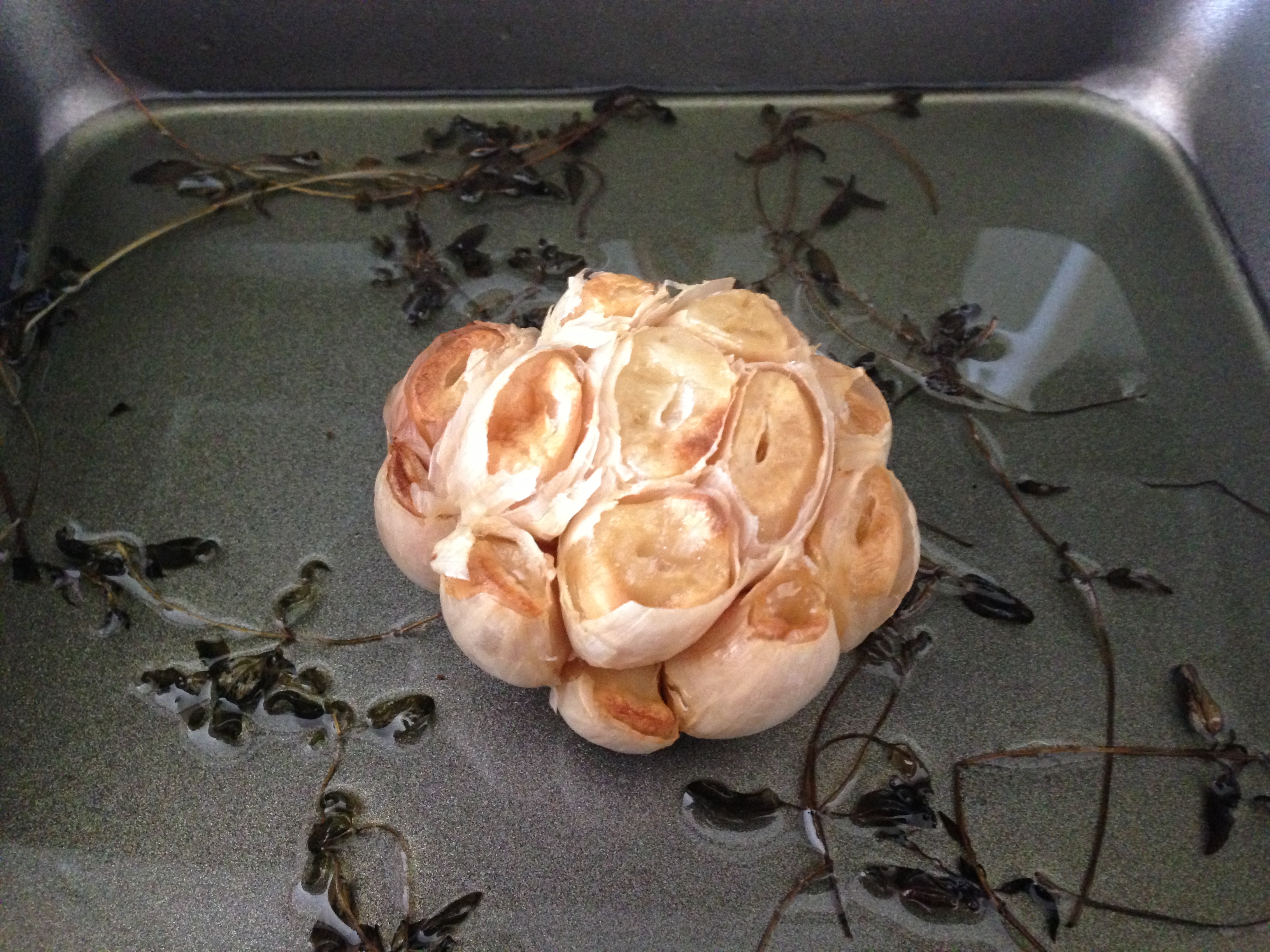 I did, however, roast an entire head of garlic (that’s a first!) in some thyme and olive oil for the mashed potatoes.