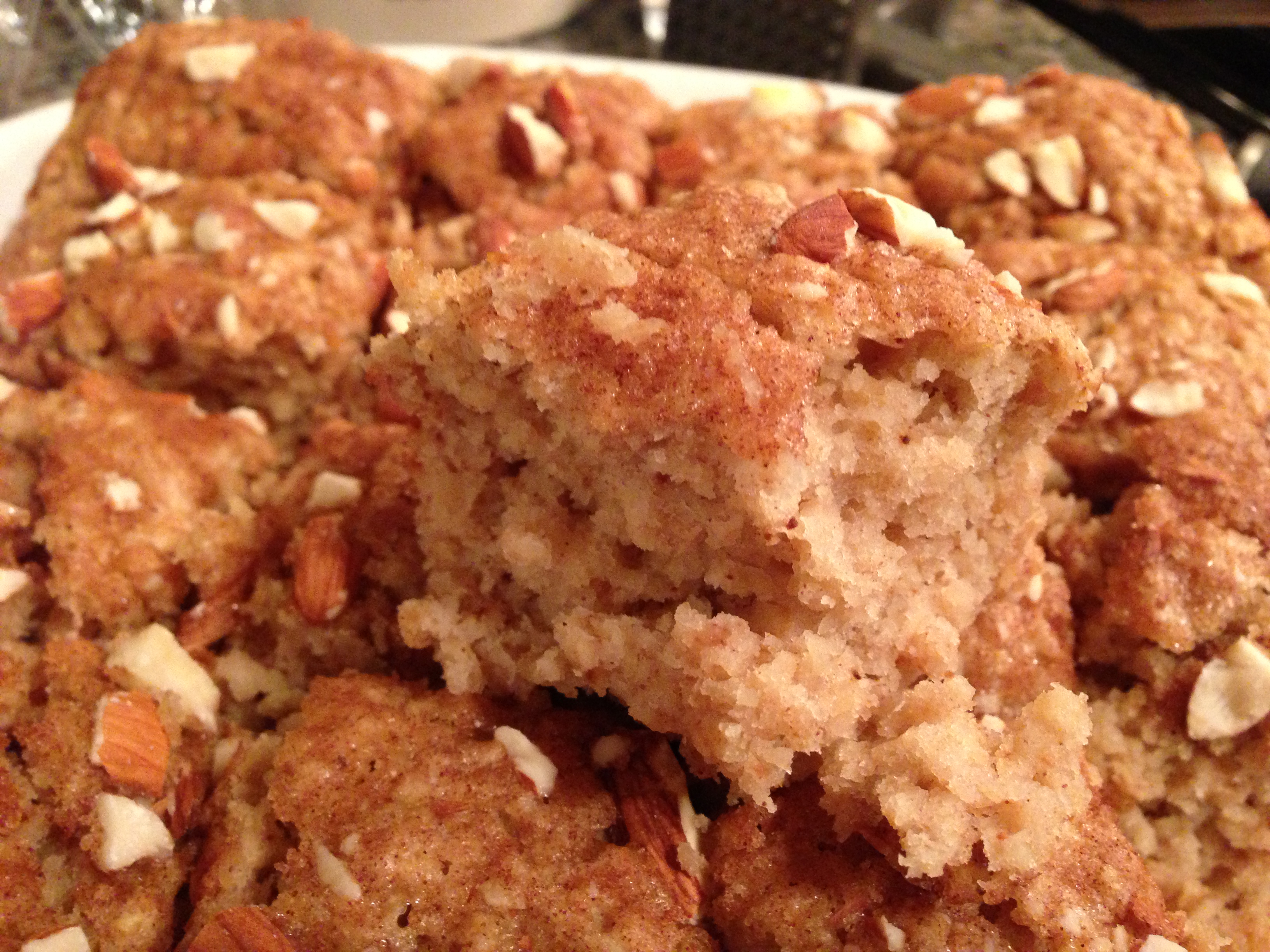 I was worried about my lack of breakfast options, so I steam-rolled ahead into making a low-sugar coffee cake with applesauce and quick oats; I found the recipe on the American Diabetes Association site, although I halved it and added chopped almonds. It has great texture – very moist. I think it’ll be good warmed with honey tomorrow. Whenever you can spare some sugar and major calories without losing out on flavor, I say do it! Applesauce (especially low or no sugar-added) is a great 1-1 substitute for butter and fats because it adds moisture. You can even use this in cookies and chocolate cake! Just make sure to reduce or at least monitor your baking time because removing some fat will usually speed the cooking process.