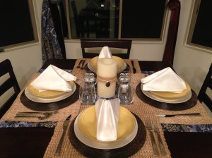 After a full day in the kitchen, Daniel and I set our table. In a flash of brilliance, I remembered how to fancy-fold napkins…