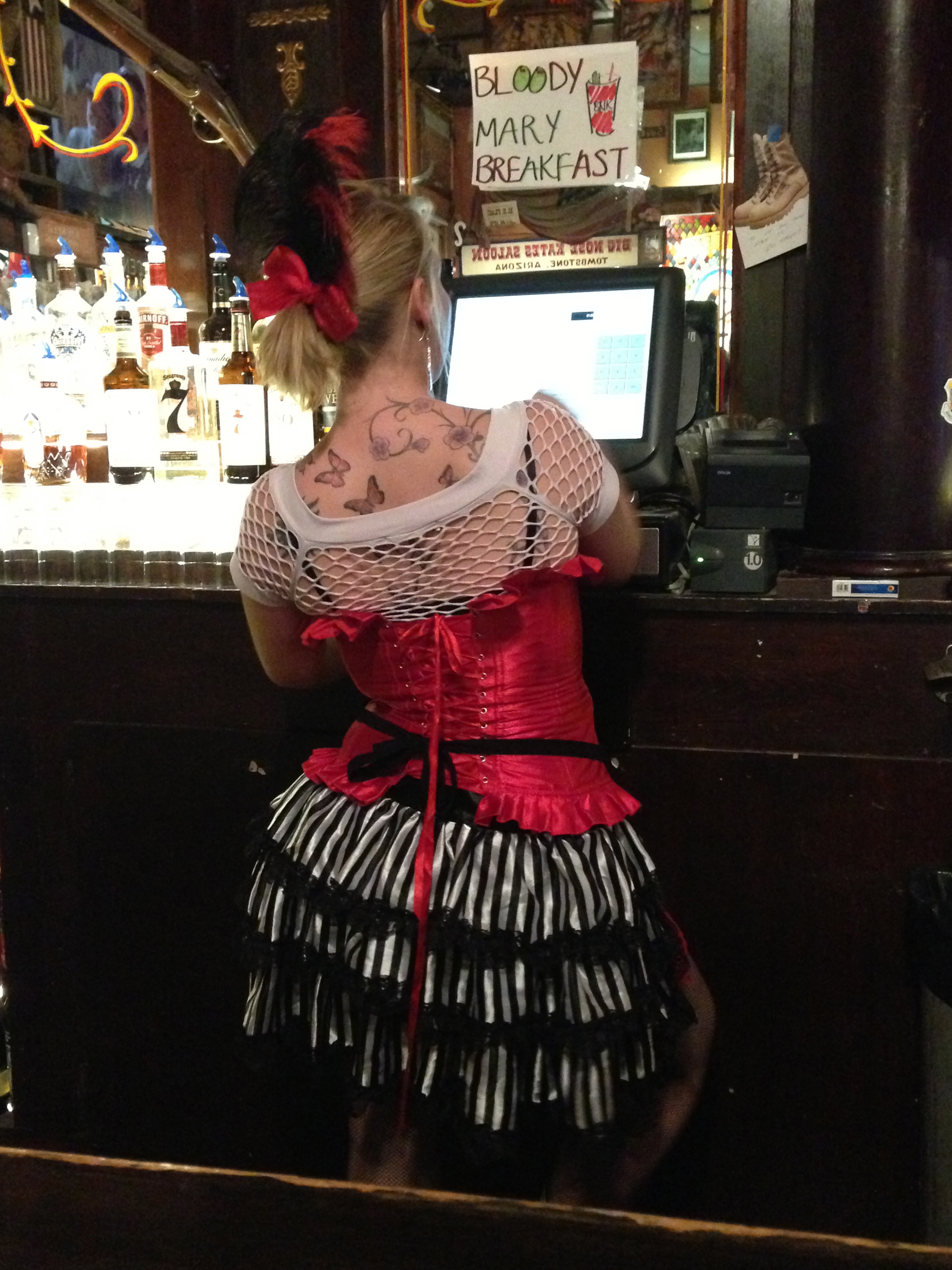 Tombstone is an old historic western town that has been preserved and converted into a respectable tourist location. There isn’t so much as a Walmart within 30 miles of the town, but somehow it stays alive with people who actually live and work there. Brave souls. To give you an idea of the seriousness of the old western vibe, below is a photo of our bar tender at Big Nose Kate’s Saloon – the saloon named after Kate, the woman who couldn’t keep her nose out of everyone else’s business.