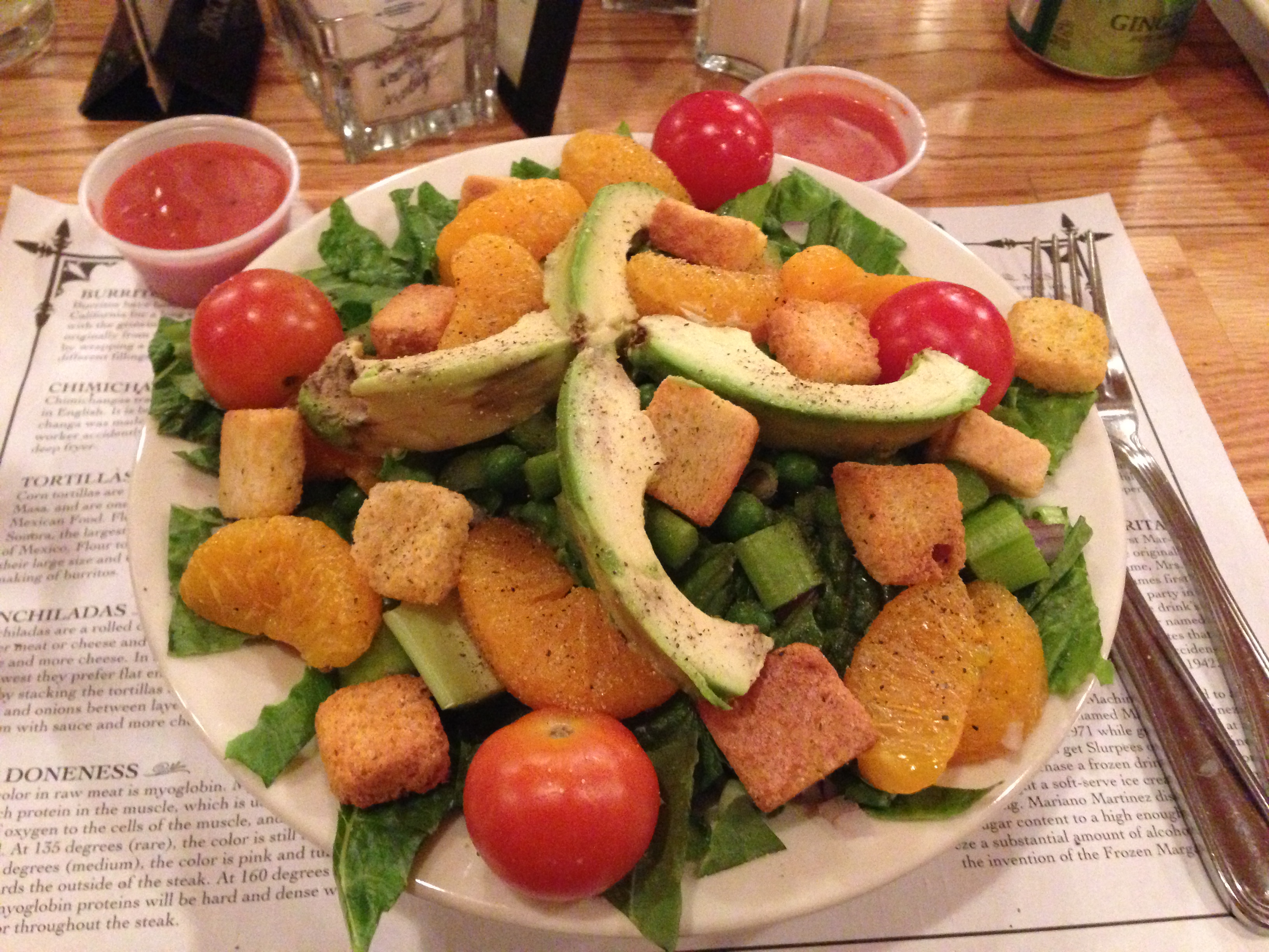 I especially like this salad because it doesn’t come with or need any cheese. The mandarine oranges are so juicy, the avocado is ripe, the greens are GREEN and the celery and peas are such a nice (and different) touch. Even though you could eat this salad without any dressing at all because it’s so flavorful and fresh, the fat-free raspberry vinaigrette is very good. The only way you could make this salad any healthier is to remove the croutons.