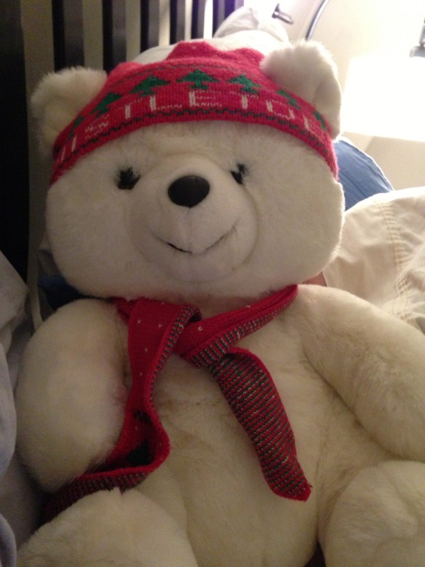 And this is my adorable Christmas bear. Doesn’t he just make you want to snuggle up and pretend you’re five years old again?