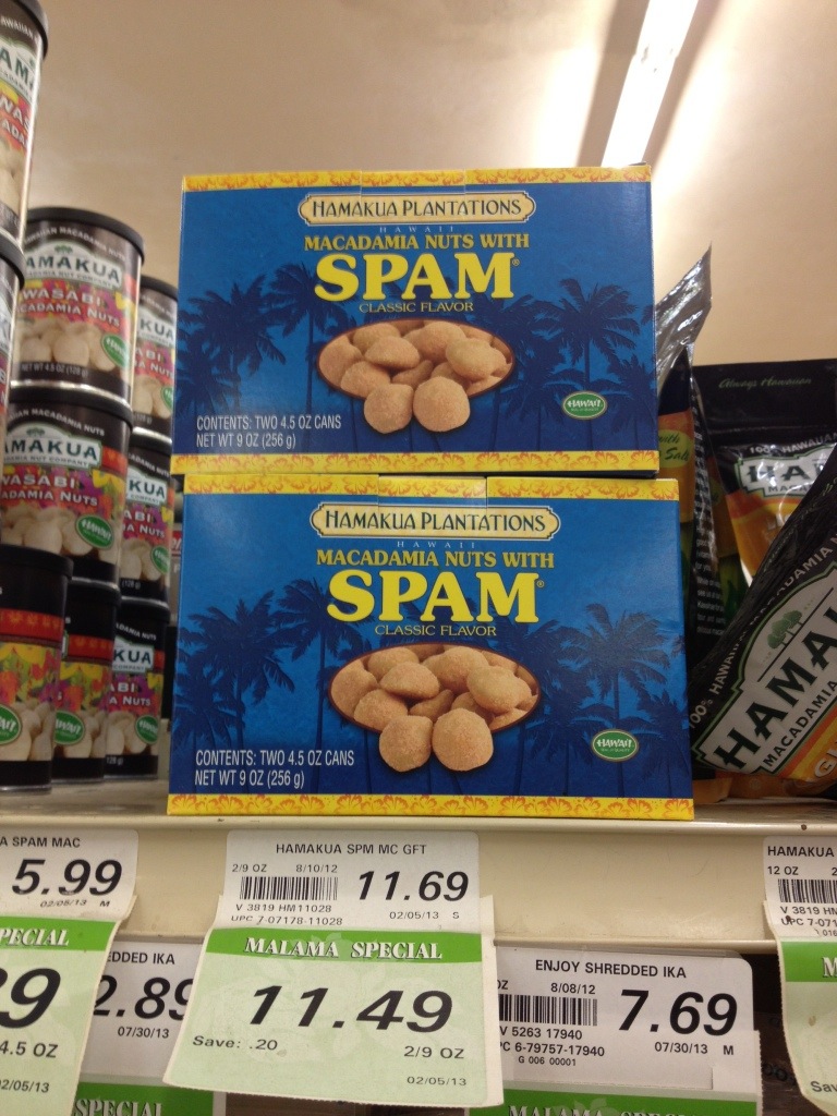 Admittedly I made it about three bites before grease started oozing out of my eyeballs. Tasty though! After the game we walked from the restaurant to the store to get a Redbox flick and some Red Bull. We didn’t find any Red Bull, but we did find Spam flavored macadamia nuts. Yum?