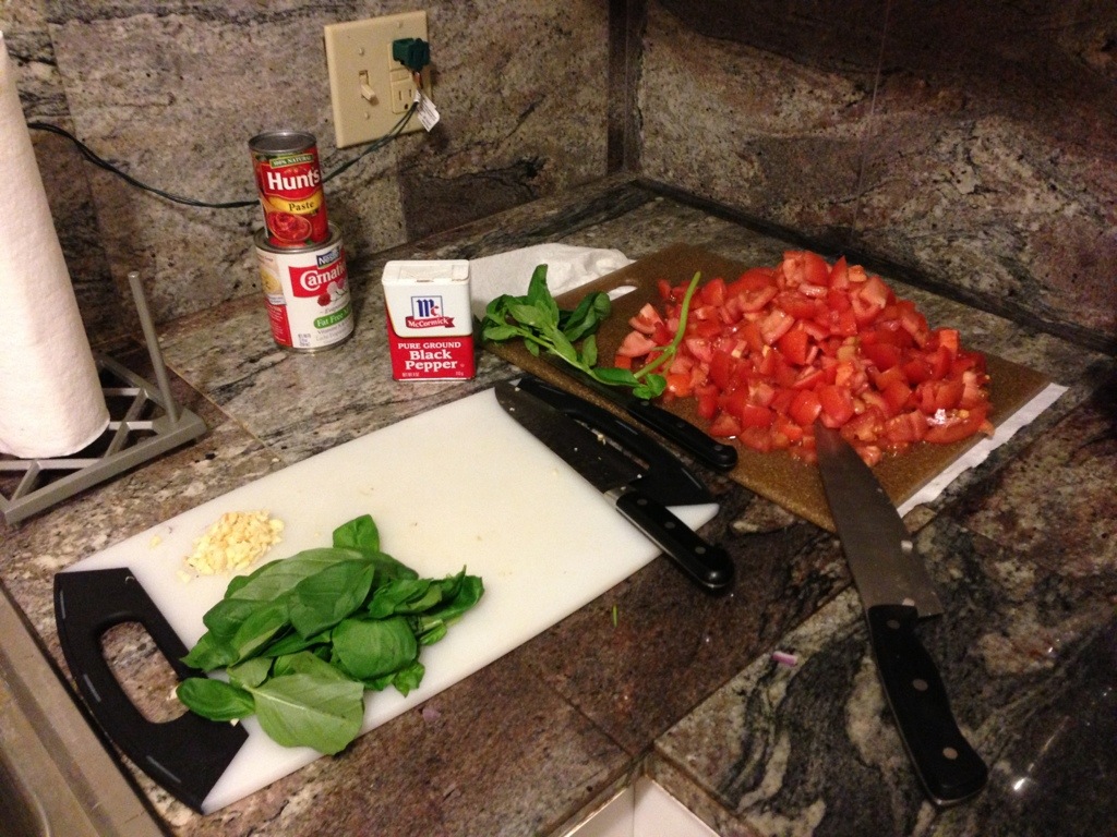 How about something that is actually appetizing? Tonight we had our first meal in the new home: Ina Garten’s fresh tomato basil soup (which I learned how to make on the elliptical today) and a modest helping of homemade macoroni and cheese.