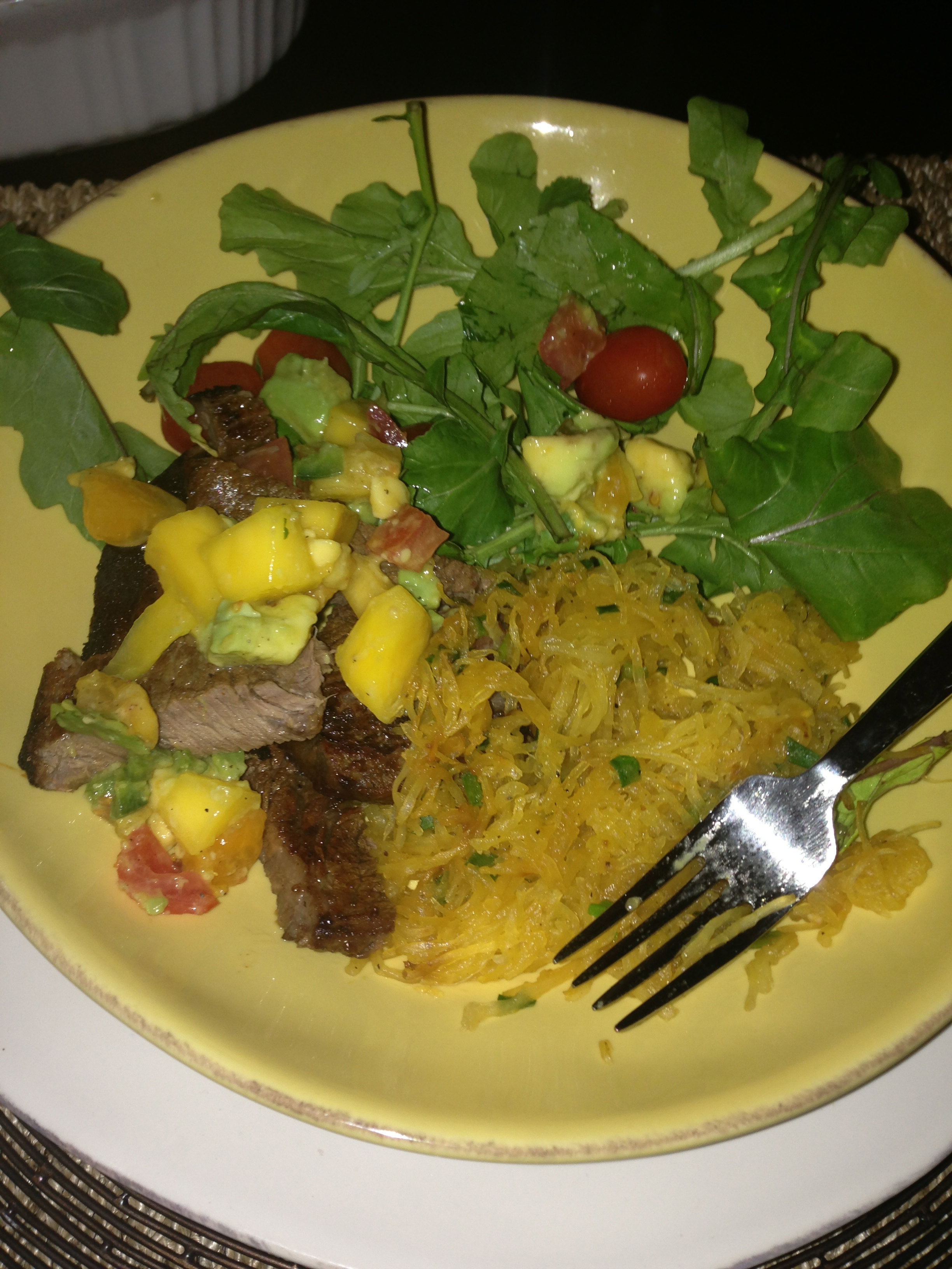 IMG_4129 Published February 19, 2013 at 2448 × 3264 in 50/50 ← Previous dead steak smothered in leftover mango-avocado salsa with a side of spaghetti squash