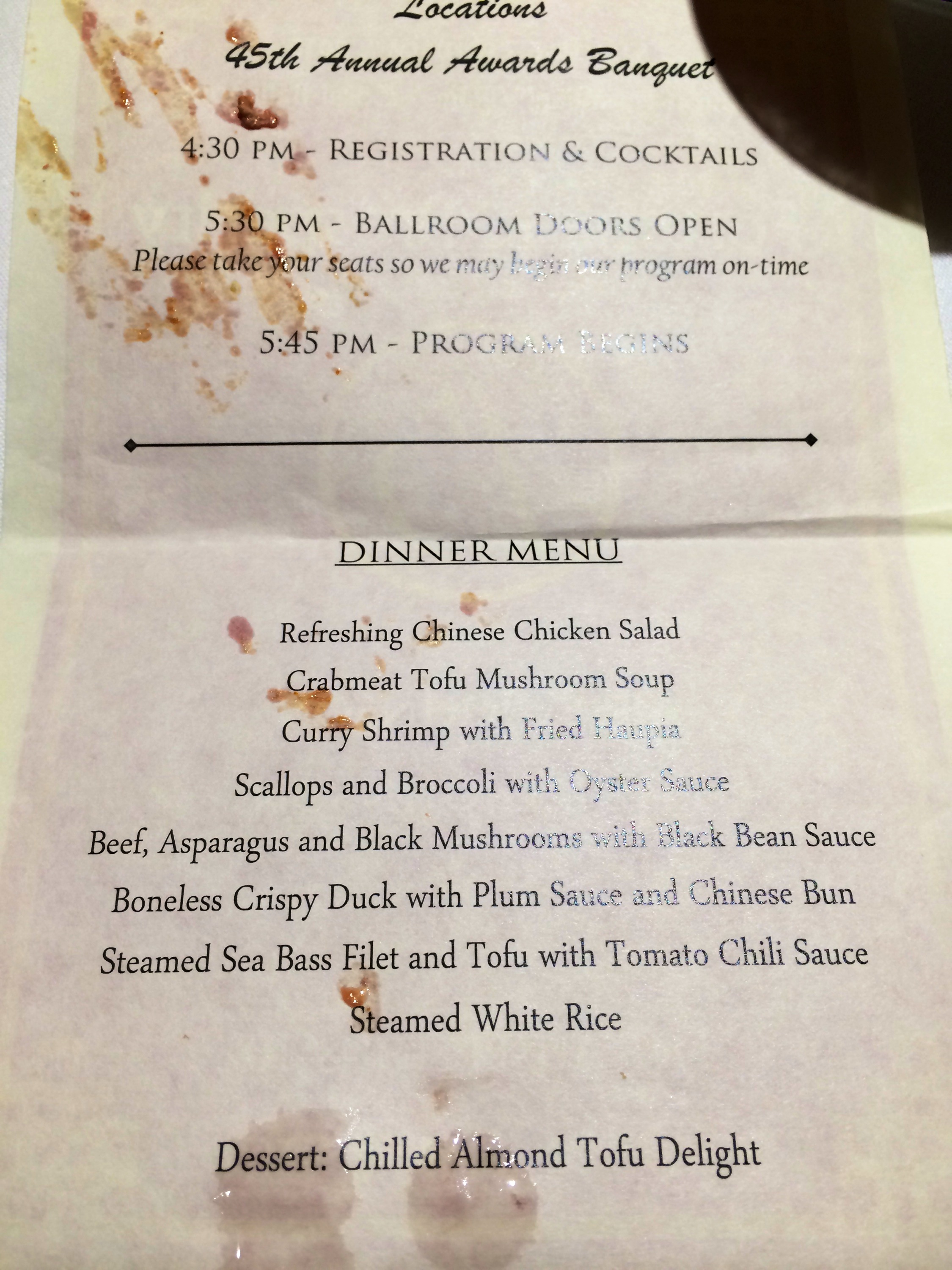 After a few introductions and several awards, dinner was upon us. Clearly we had a good year because there was more food than we knew what to do with. It just kept coming, and coming, and coming. Here is a pic of the menu, after a curried shrimp took a dive.