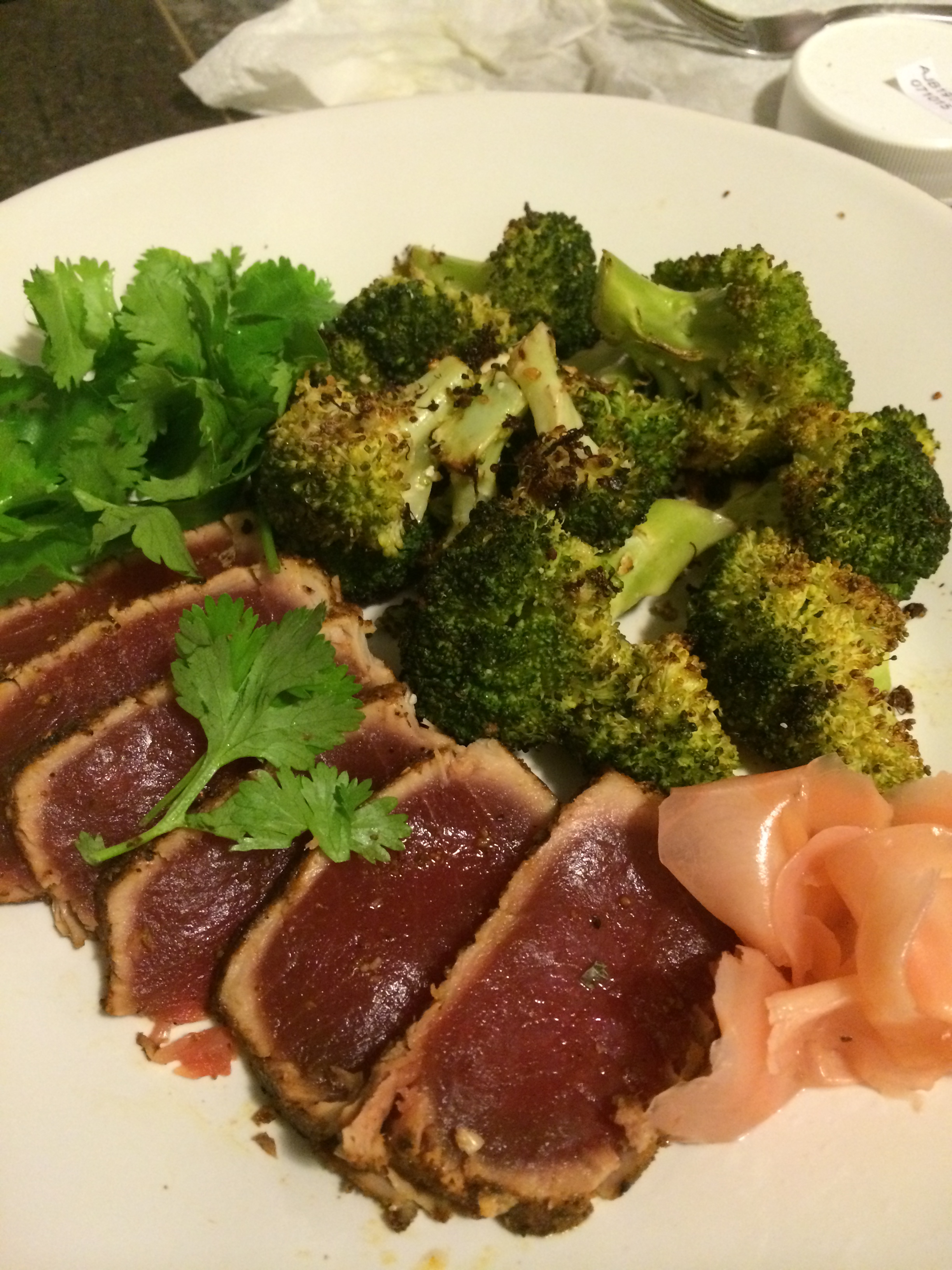 Everyone’s got their favorite food and mine happens to be tuna. Raw, seared, baked, broiled, battered, blackened, or canned. If it weren’t for the mercury (and the price!) I’d have it daily. Two of my favorite preparations are sashimi style over sweet, sticky Japanese rice or blackened and seared rare with cilantro and pickled ginger. The latter is exactly what I had last night.
